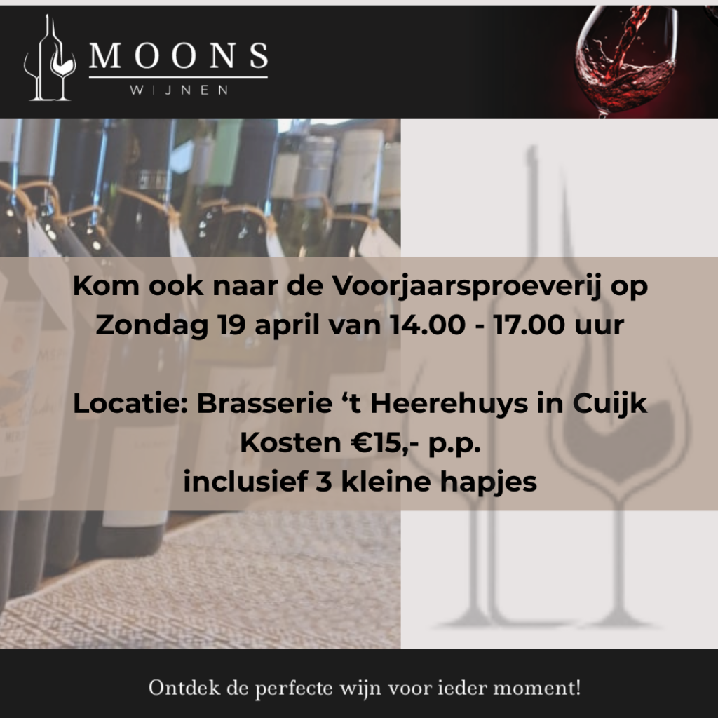 Geniet van een gezellige wijnproeverij bij jou thuis Ben je op zoek naar een wijnproeverij aan huis in Cuijk of omgeving? Bij Moons Wijnen verzorg